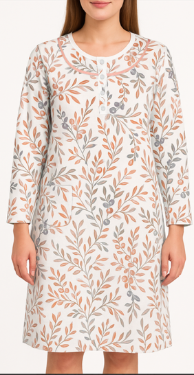 Heerlijke zacht gevoerde nachtpon met een normale lengte. 90% katoen. Met deze pon ben je klaar voor de komende koude maanden. Super fijn om te dragen ook als je ‘smorgens nog even door het huis wil lopen. Verkrijgbaar in maten M t/m XXXL in 4 verschillende kleuren. Mooi dessin met takken.