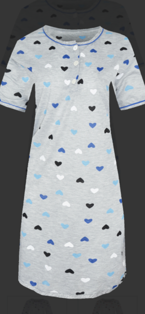 Vlot nachthemd van 90% katoen met korte mouwen. Heerlijke zachte katoen kwaliteit die als ondergrond lichtgrijs is en de ruitprint in zwart, bordeaux, blauw of groen. De ruitprint kan ook worden geleverd met een ander design bijv. een ankertje of hartjes. De ondergrond blijft grijs-melee maar de dessins variëren bijna maandelijks in ons assortiment. Verkrijgbaar in de maten M t/m XXXL. En dat voor een zeer voordelige prijs van maar 6.95